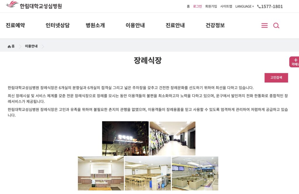 빈소정보(고인검색) : https://hallym.hallym.or.kr/hallymuniv_sub.asp?left_menu=left_mguide&screen=ptm908